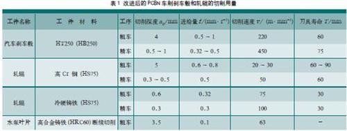 (2)近年來,PCBN刀具的應用逐漸增多,最明顯的是進入冶金工業(yè)中軋輥和汽車工業(yè)中汽車剎車車轂以及鉆探工程的泥漿泵的加工。與原用的硬質(zhì)合金和陶瓷刀具相比,PCBN刀具取得了令人滿意的結(jié)果,其切削用量如表1所示。從表中可知,改進后的切削深度、進給量都很大,切削速度也較高,可以獲得較高的加工效率。過去這類產(chǎn)品加工都用硬質(zhì)合金和陶瓷車刀,現(xiàn)在已被PCBN刀具代替,這是一個很大的進步。
