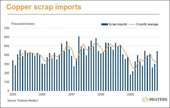 實質(zhì)需求、商業(yè)領(lǐng)域庫存補充、政府庫存儲備以及投機活絡(luò)均混在一起. 進口仍遠高于歷史常態(tài),隨著倫敦至上海的套利窗口再次開啟,當(dāng)前的共識是銅進口在未來數(shù)月還會保持強勁. 不過,要對廢銅進口予以關(guān)注. 2008年底廢銅進口的崩潰,亦推動中國對精煉銅的需求,影響范圍涵蓋二級生產(chǎn)商和冶煉商,這些企業(yè)將廢銅當(dāng)直接熔融材料使用. 近幾個月來廢銅進口有所回升,但仍低于歷史水準(zhǔn),如下面連結(jié)英文圖表所示。CNMn。