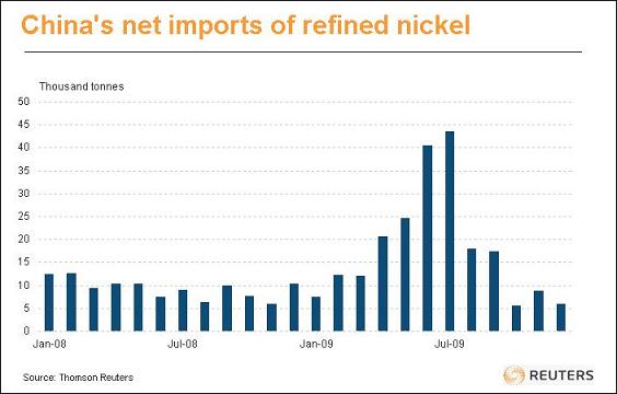 鎳 中國方面策略性鎳短缺,多年來均為凈進口國.而由于不銹鋼產(chǎn)業(yè)仍舊呈現(xiàn)爆炸性成長,該國的需求只會增加不會減少. 不過,從下面圖表可以清楚看到中國已暫時呈現(xiàn)飽和: