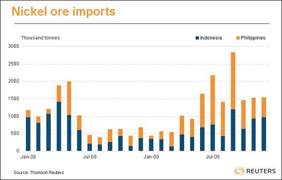 凈進口在2009年第四季大幅減少,且出口增加.中國顯然已降低庫存階段.而當(dāng)?shù)睾嚿F(NPI)產(chǎn)出再次增加也是影響因素之一. 自印尼和菲律賓等主要原料供應(yīng)商進口礦石的情況,可用來判斷含鎳生鐵的生產(chǎn)水準(zhǔn). 以下英文圖表顯示過去數(shù)月來自兩國的礦石進口: