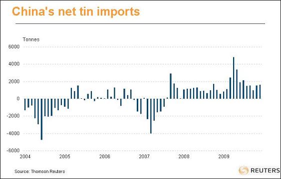 錫 做為全球最大的錫生產(chǎn)商,中國曾經(jīng)是該金屬的凈出口國,但從2007年底轉(zhuǎn)為持續(xù)凈進口國,如下列英文圖表所示: