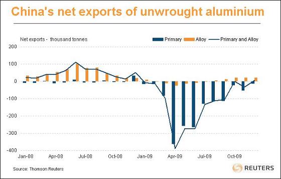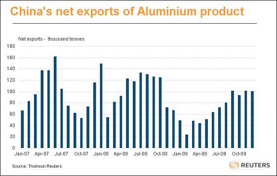 另一項讓過剩金屬順利輸出的方式,就是制成產(chǎn)品.中國生產(chǎn)商對于避開基本金屬繁重的出口稅已相當(dāng)在行,只要稍加修飾,即可以"產(chǎn)品"出口. 因此,需要注意之後的"產(chǎn)品"凈出口.這類出口已自2009年初低點大幅回升,并在10萬噸水準(zhǔn)附近持穩(wěn),如下圖所示: