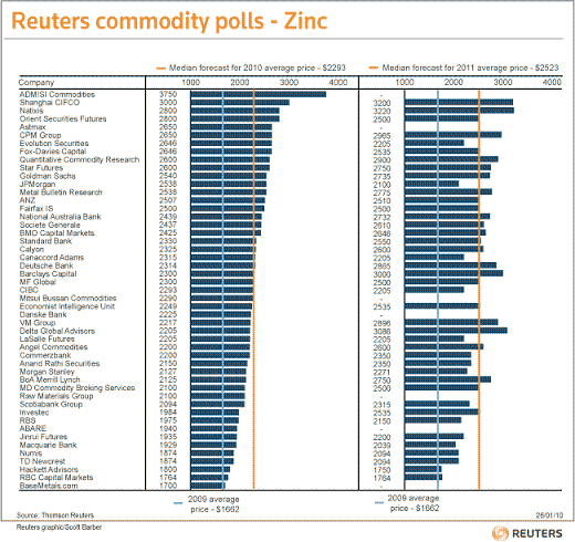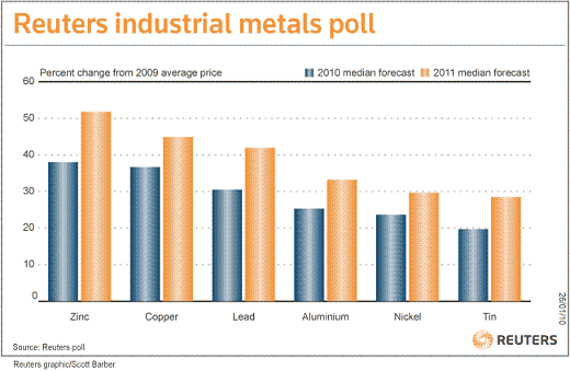 倫敦1月26日電---路透對金屬分析師的調查周二(26日)出爐,一如以往,當中透露出市場的集體心態.表面來看,調查結果鞏固了市場上看多的普遍共識,這是伴隨倫敦金屬交易所(LME)市場自2009年初低點強力復蘇的上攻氣勢而來. 下列鏈結圖表主要顯示2010年金屬價格預估較2009年的百分比變動: