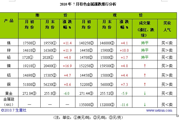 7月的高溫一浪高過一浪,7月的有色市場也開始進入“伏天”,與6月份相比是大相徑庭,上月是“綠色環保型”,而本月幾乎所有有色產品“全線飄紅”,在 短短的一個月之內,有色市場即由綠轉紅,變換了季節。在生意社重點監測的8種產品中(數據截止到7月29日),呈現上漲的有6種產品,下跌的只有黃金和金 屬硅,鎳、鋅、錫高居漲幅榜的前三甲,漲幅均超過10%,而黃金本月的跌幅也創了上半年以來月度變化的最高,達6%。對比上月的漲跌榜,本月的有色產品漲 跌榜有兩大特點: