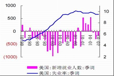 首先,從OECD領先指標來看,全球主要經濟體增速放緩態勢基本確認。美國與中國等亞洲國家出現掉頭下降,日本與德國還在上行中,但由于兩個國 家復蘇的基礎是出口,隨著新興經濟體的增長放緩,兩個國家的上行趨勢能否保持依然存在較大的疑問。當前,全球經濟的系統性風險在減少,但經濟復蘇放緩卻也 是不爭的事實。一方面,歐洲債務危機得到緩解,危機國成功發行債券籌措到資金,歐洲銀行業也通過了壓力測試;而另一方面,隨著刺激政策效果的消退,美國經 濟復蘇的動力明顯放緩。歐洲受惠于強勁出口的推動亦難以延續至第四季度。失業、收入、財政赤字等長期因素成為拖累經濟持續復蘇的主因。這將導致發達國家進 入持續高失業率、低增長率的弱勢復蘇時期。