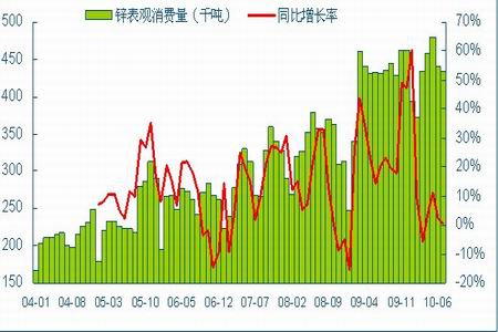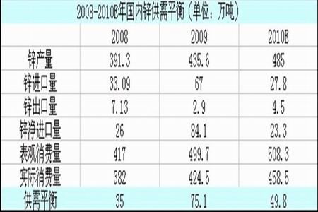 國內的情況亦較為樂觀,根據上海有色金屬網的調研(SMM)2010年1-7月份國內鋅下游行業平均開工率在73.02%,除鍍鋅行業受國家房 地產政策調控等影響開工率又有起伏以外,壓鑄合金、電池、黃銅、氧化鋅行業的開工率都在高位運行。SMM預計今年國內精煉鋅的實際消費將達到458.5萬 噸,同比有8%左右的上升。