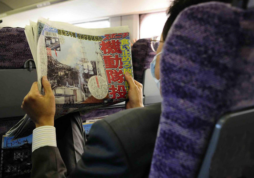 3月17日下午,在一列前往東京的新干線列車上,一名日本人在閱讀關(guān)于福島核電站三號(hào)機(jī)組最新狀況的報(bào)道。