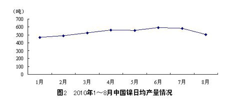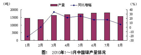 2010年8月,中國鎳產量為15667噸,同比增長6.7%,環比下降13.2%。1~8月,中國鎳產量為127512噸,同比 增長15.7%。整體來看,2010年以來,除2月份春節假期因素影響部分生產之外,中國鎳產量呈增長態勢,且與2009年同期相比,整體也有較快增長。