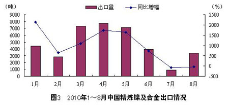 8月,中國共出口精煉鎳及合金3346噸,同比下降30.1%,環比增長268.9%。1~8月,中國共出口精煉鎳及合金 37855噸,同比增長227.6%。整體來看,2010年以來,精煉鎳及合金出口以4月為分界線,1~4月為增長期,4~8月為下降期,此外,與 2009年同期相比,各月總體呈增長態勢。