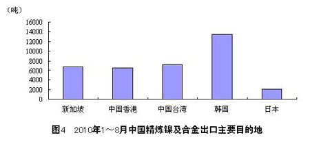 1~8月,中國共向新加坡出口精煉鎳及合金3188噸,同比增長628.4%;向韓國出口13447噸,同比增長 705.9%;向中國臺灣出口7196噸,同比增長155.1%;向日本出口2044噸,同比增長1513620%;向中國香港出口6655噸,同比增長 8.3%。