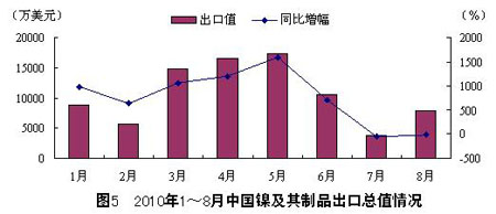 從出口總值來看,8月,中國鎳及其制品出口總值為7840萬美元,環比增長110.2%,同比下降12.3%。1~8月,中國鎳及其制品出 口總值為85856萬美元,同比增長269.9%。整體來看,2010年以來,中國鎳及其制品出口總值以5月為分界線,1~5月為增長期,5~8月為下降 期,且與2009年同期相比,各月整體呈增長態勢,而5月增幅最大,為1591.0%。