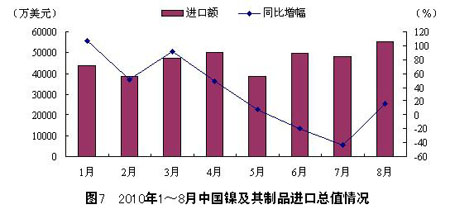 從進口總值來看,8月,中國鎳及其制品進口總值為55383萬美元,環比增長15.2%,同比增長15.2%。1~8月,中國鎳及其制品進 口總值為373471萬美元,同比增長6.9%。整體來看,2010年以來,鎳及其制品進口總值呈漲跌互現的局面,且與2009年同期相比,整體呈增長態 勢。