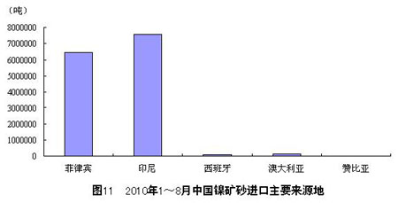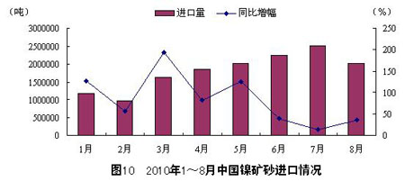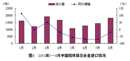 8月,中國共進口鎳礦砂2030080噸,同比增長35.0%。1~8月,中國共進口鎳礦砂14353323噸,同比增長 61.3%。盡管8月份的進口量下降,但整體來看,2010年以來,中國鎳礦砂進口呈增長態勢,8月進口量較1月增長75.8%,且與2009年同期相 比,更多地表現為巨幅增長,體現出中國需求在不斷增加。
