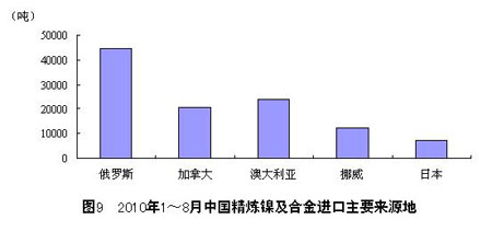 1~8月,中國共從俄羅斯進口精煉鎳及合金44493噸,同比下降26.2%;從澳大利亞進口24267噸,同比下降 31.5%;從加拿大進口20465噸,同比下降36.7%;從挪威進口12287噸,同比下降60.3%;從日本進口7266噸,同比增長64.5%。