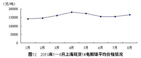 根據上海現貨價格統計,8月,上海現貨1#電解鎳的平均價格為166159元/噸,環比增長7.1%。其中,最低價平均為 165614元/噸,最高價平均為166705元/噸。1~8月,1#電解鎳的平均價格為159737元/噸。整體來看,2010年以來,上海現貨1#電 解鎳的平均價格以4月為分界線,1~4月為增長期,4~6月為下降期,6~8月有所回升。