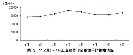8月,上海現貨1#金川鎳的平均價格為166682元/噸,環比增長7.0%。其中,最低價平均為166341 元/噸,最高價平均為167023元/噸。1~8月,1#金川鎳的平均價格為160190元/噸。整體來看,2010年以來,上海現貨1#金川鎳的平均價 格以4月為分界線,1~4月為增長期,4~6月為下降期,6~8月有所回升。