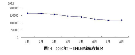 截至8月31日,LME鎳庫存相比較7月的117498噸增加1164噸至118662噸。2010年以來,LME鎳庫存整體呈下降趨勢,8月庫存較1月下降了28.0%。