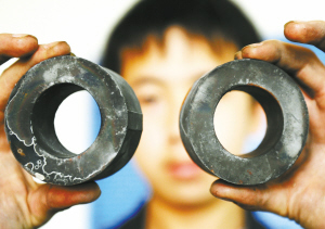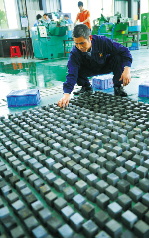 江西磊源永磁材料有限公司工人在展示釹鐵硼稀土材料。 |